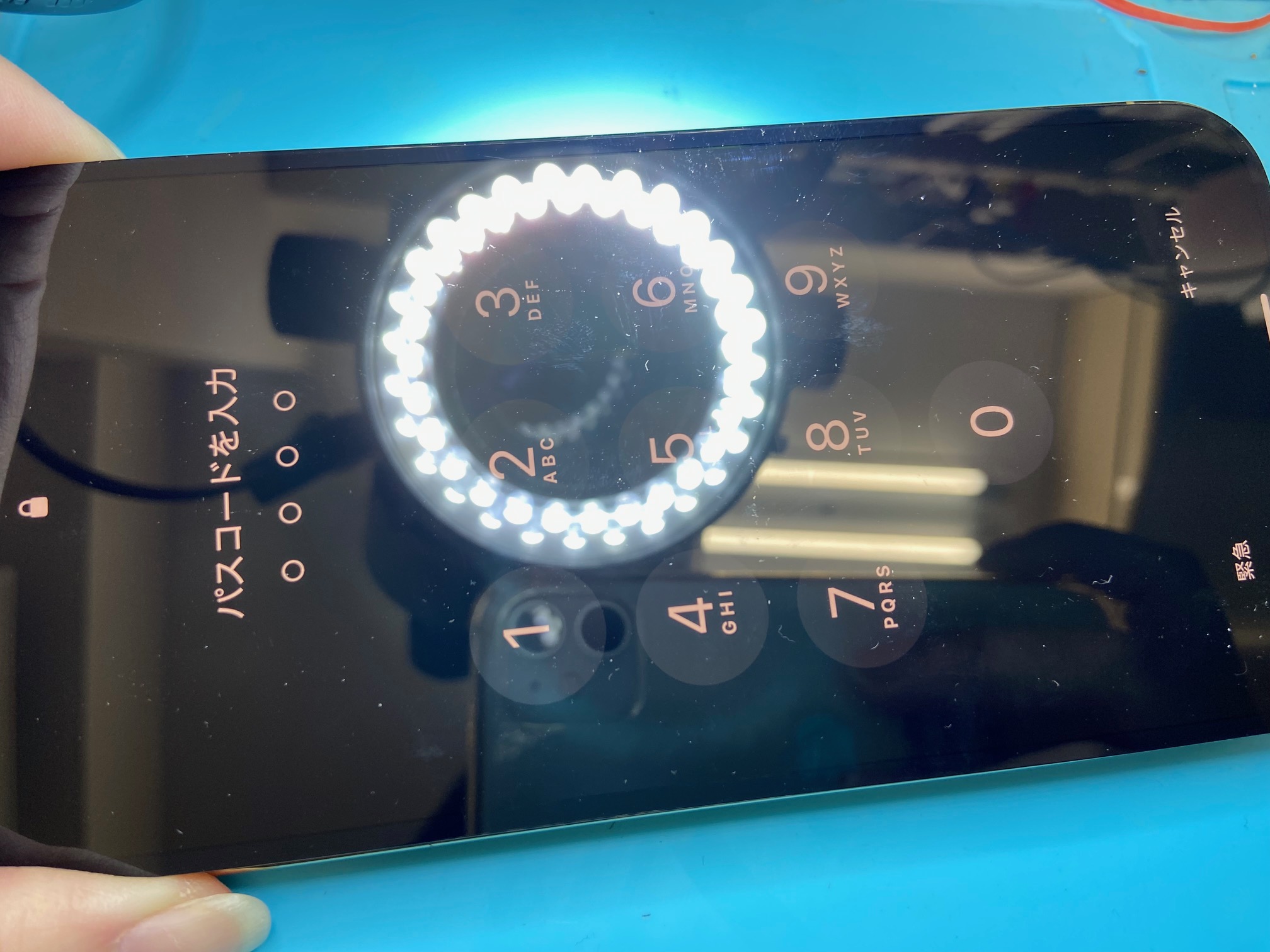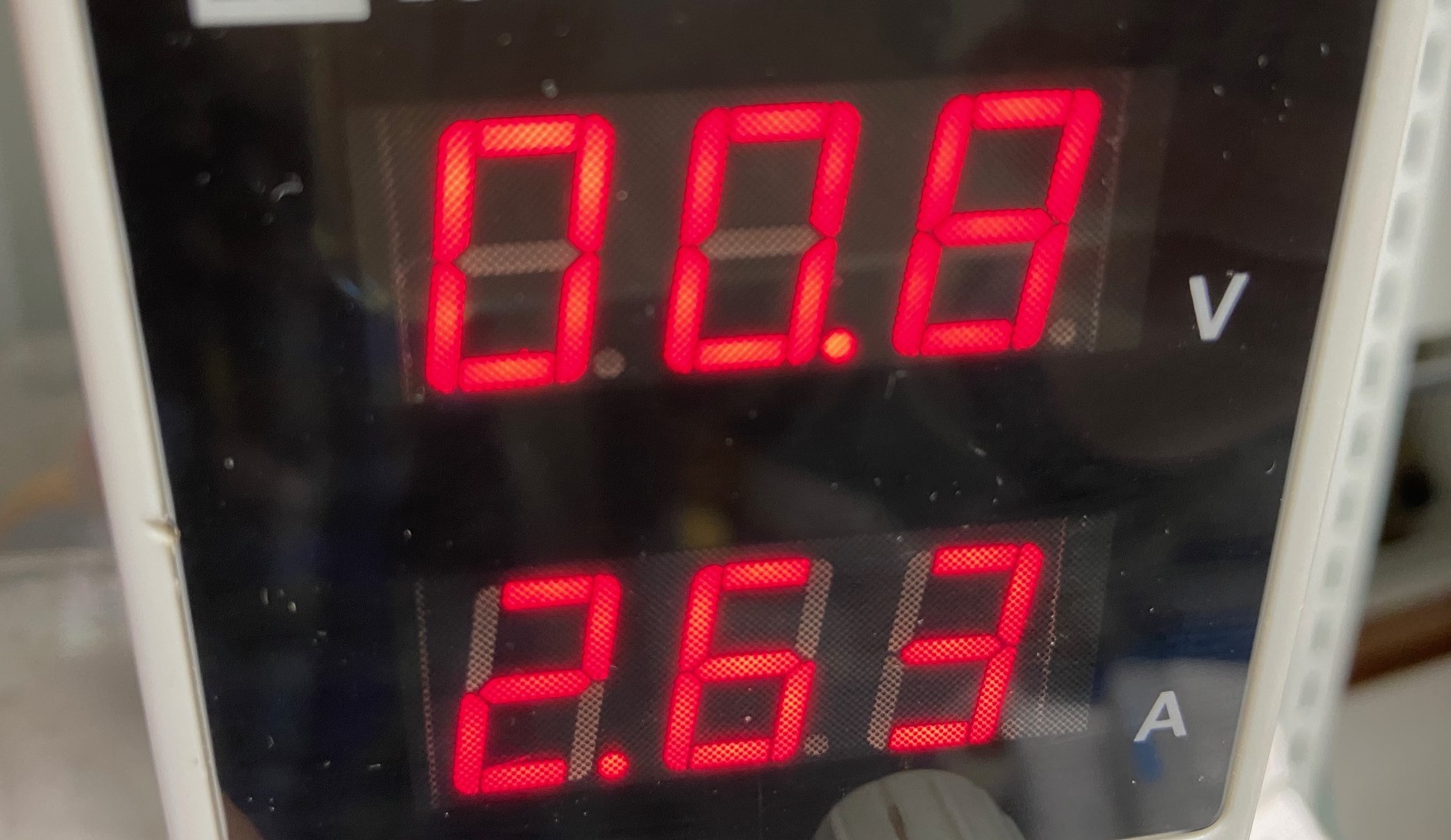発熱、ショート傾向が観察された箇所から回路を遡り、故障箇所の修復を終え、再度基板を接合し直したら、まず「ディスプレイのみ」を取り付け、あとは直流安定化電源にてチェックを行います。