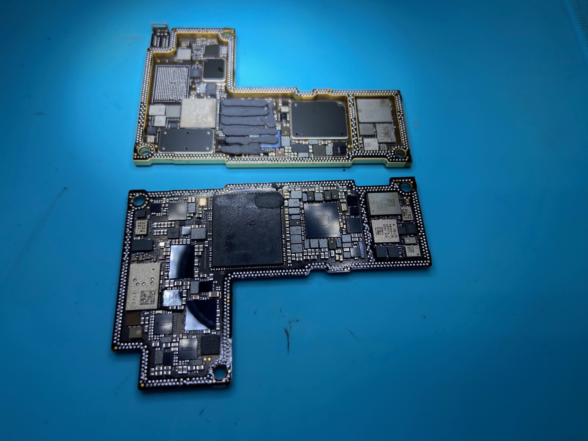 iPhone12シリーズ以降、iPhoneXシリーズや11シリーズの2層基板とは違って半田の接合面がとても強力になっています。