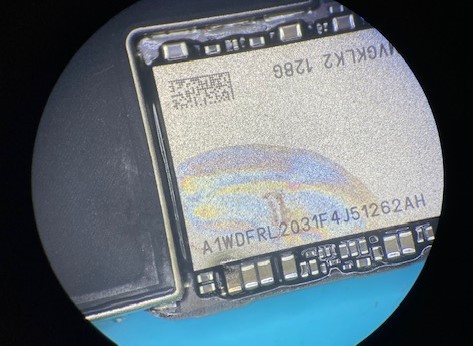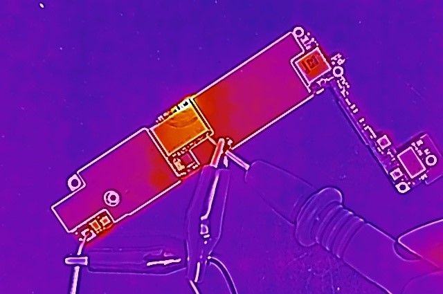 サーモグラフィー等、必要に応じた機器を用いて損傷部位特定し、予測していたメモリ付近回路にショートが見つかったため、そちらの修復作業を行いました。